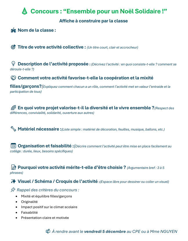 Le parlement du collège qui s’est réuni le 24 novembre réunissant les élèves délégués de chaque classe a proposé de réfléchir ensemble à une action pour le dernier jour de l’année.