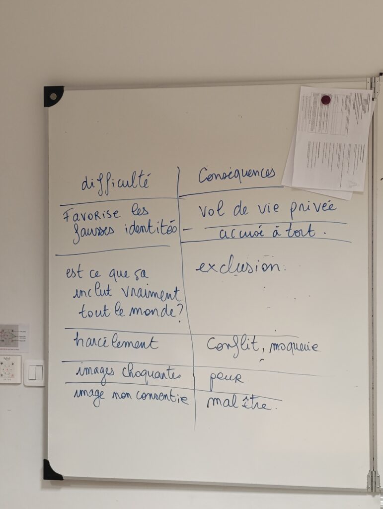 Nous avons ensuite approfondi notre analyse en classant les dangers dans de grandes catégories comme le harcèlement, les données personnelles ou la santé. Nous avons préparé des questions que nous avons posées à Mme Anaïs BELOUASSA-CHERIFI, notre députée, lorsqu’elle est venue dans notre établissement, et nous avons échangé avec elle sur les lois existantes et leurs limites.
