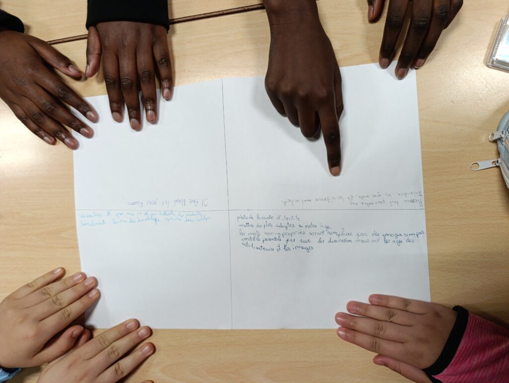 Lors des premières séances, nous avons identifié les principaux dangers des réseaux sociaux à partir de situations concrètes que nous avons analysées ensemble. Nous avons aussi découvert ce qu’est le Parlement des enfants, le rôle d’un député, ce qu’est une loi et une proposition de loi.