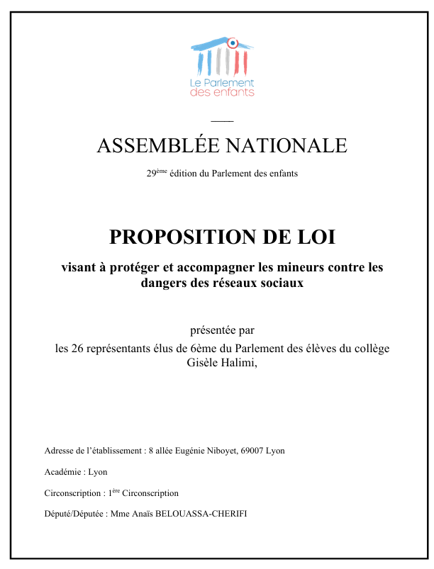 Nous sommes les 26 élèves élus du niveau de 6eme (14 délégués des 7 classes de 6eme, les élus 6eme du : CVC, éco délégués, sentinelles référents pour la lutte contre le harcèlement) et nous représentons donc notre niveau au parlement des élèves de notre collège. En tant qu’élus nous avons mené un travail en plusieurs séances pour élaborer notre proposition de loi sur la protection des mineurs contre les dangers des réseaux sociaux. Chaque séance a eu un objectif précis et nous a permis d’avancer étape par étape.